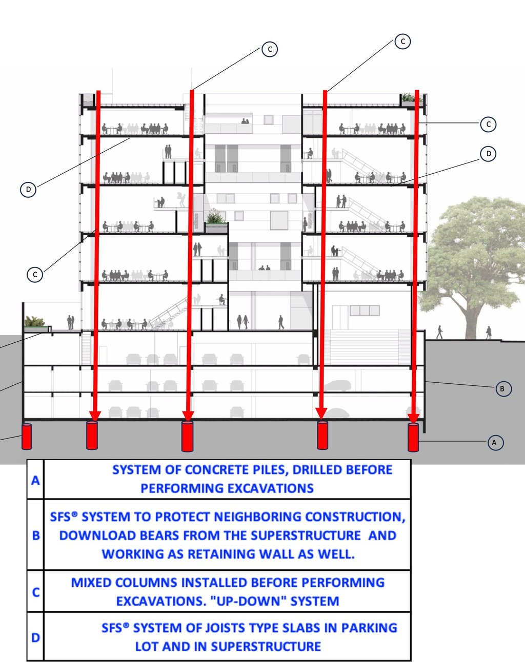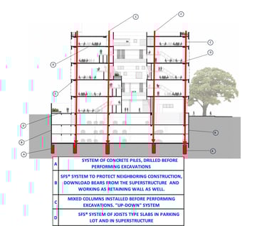 3.- (A-C) Building system identified as "UP-DOWN", which allows erecting the superstructure before starting the excavations for underground garages.