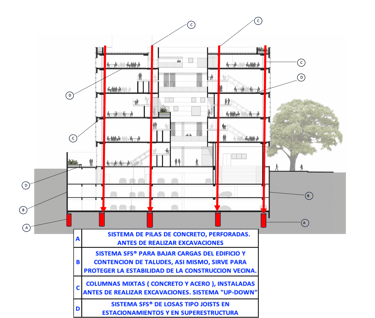 3.- (A-C) Sistema de edificación "UP-DOWN" system, que permite erigir la superestructura antes de empezar con las excavaciones para garages subterráneos.