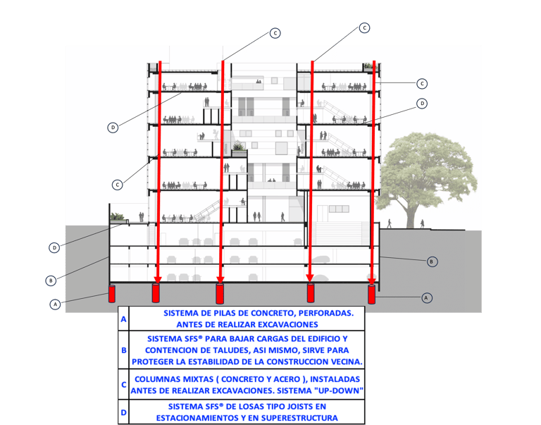 1.- (A-B) Sistema SFS® de muros de contención en estacionamientos subterráneos y protección a colindancias. Sin necesidad de Anclas ni muros provisionales o troqueles desechables.